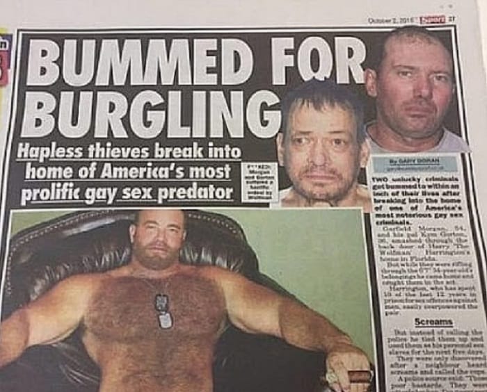 The story alleges that Harrington, a towering, muscular figure, easily subdued the intruders, tied them up, and sexually assaulted them for five days. The tale concludes with the police arriving only after neighbours heard cries for help, finding the burglars traumatised and Harrington unfazed.