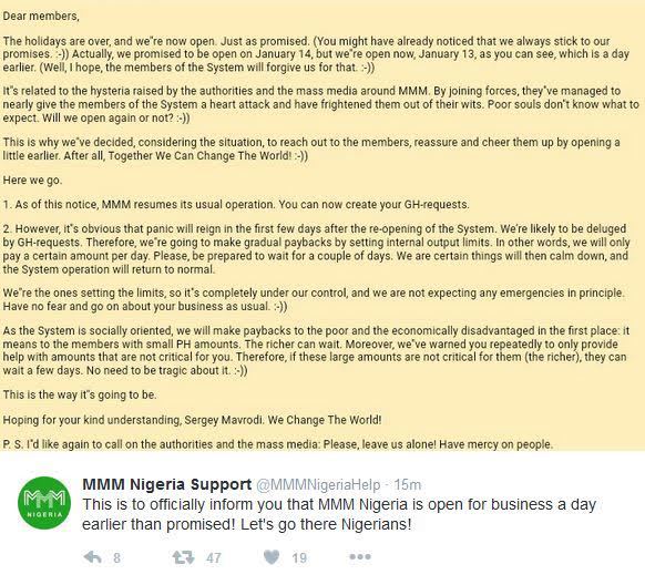 “This is to officially inform you that MMM Nigeria is open for business a day earlier than promised! Let’s go there Nigerians,” the post said.
