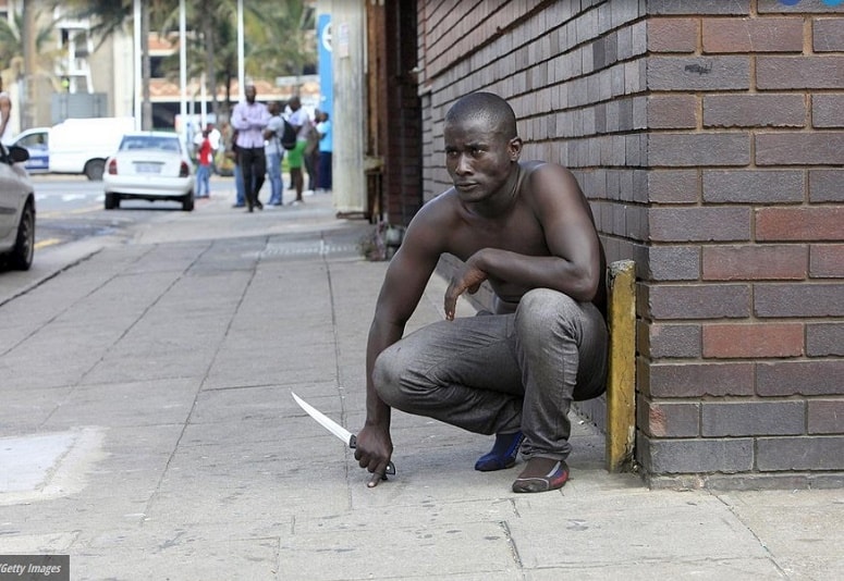 | A foreign national holds a knife following clashes between a group of locals and foreigners in South Africa. |
