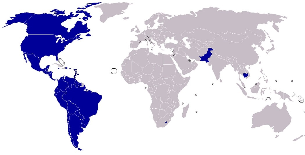The following map illustrates which countries (marked in blue) seem to observe jus soli citizenship rights: