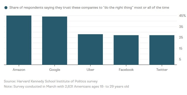 Overall, 45 percent of 18- to 29- year olds indicated that they trust Amazon, and 44 percent reported that they trust Google, “all” or “most of the time.”