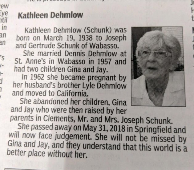 According to that obituary, after marrying in Minnesota in 1957, Kathleen bore two children named Gina and Jay. But in 1962 she became pregnant by her brother-in-law and moved to California, abandoning her two children in the process and leaving them to be raised by her own parents: