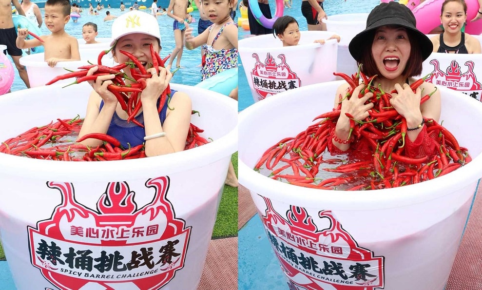 Called the hot chili bath challenge, participants are required to sit in a bucket filled with hot chili peppers and water.
