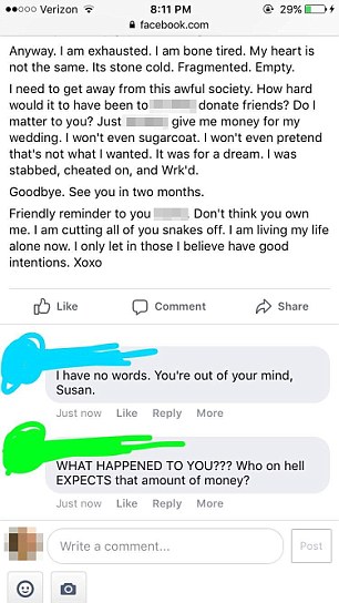 In a lengthy Facebook rant, a Canadian bride-to-be identified as Susan explained why she called off her wedding and broke up with her fiancé because invited guests could not pay $1,150 each to attend.