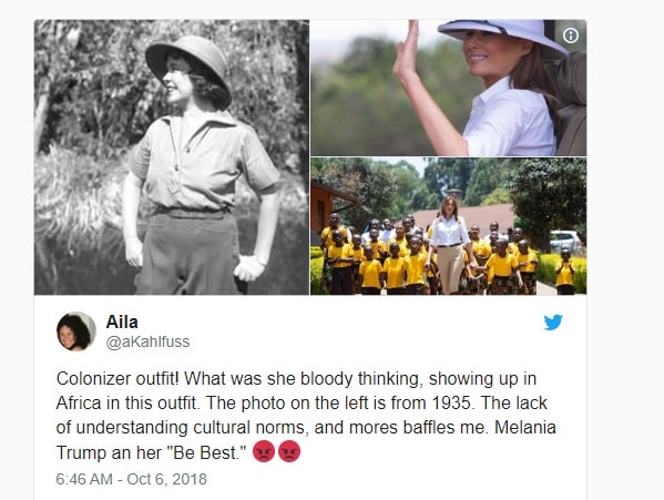 “Colonizer outfit! What was she bloody thinking, showing up in Africa in this outfit. The photo on the left is from 1935,” another tweeted.