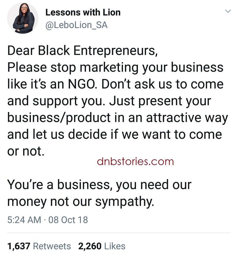 UncategorizedEvery entrepreneur should see this message October 9, 2018March 23, 2020 - by dnbstories - Leave a Comment by Staff writer I feel it’s spot on! ??? Share this post with your friends: Related posts: 12 cool spots to hang out in Lekki and their locations Bill Zeller’s heartbreaking suicide note that shook the world! Love Story: A Wonderful Neighbour How Anxiety Can Motivate You Discover Your Love Language! Short Story: Once Upon A Journey! How I became addicted to sleeping with married women – My Life’s Story Ola – The Tale of a Young Moon Maiden by Daniel Nkado Short Story: A Twist of Love! Ebubedike and the Desertlings of Uforo – 4