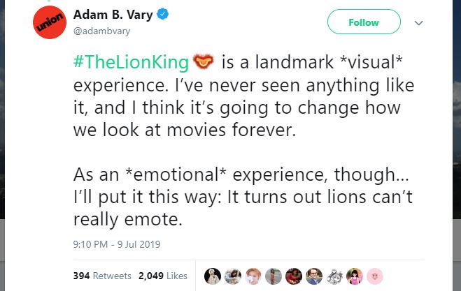 BuzzFeed’s senior reporter, Adam B. Vary, said the CGI lions were not able to capture real human emotions.