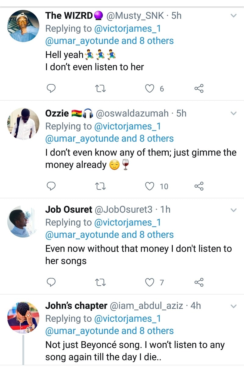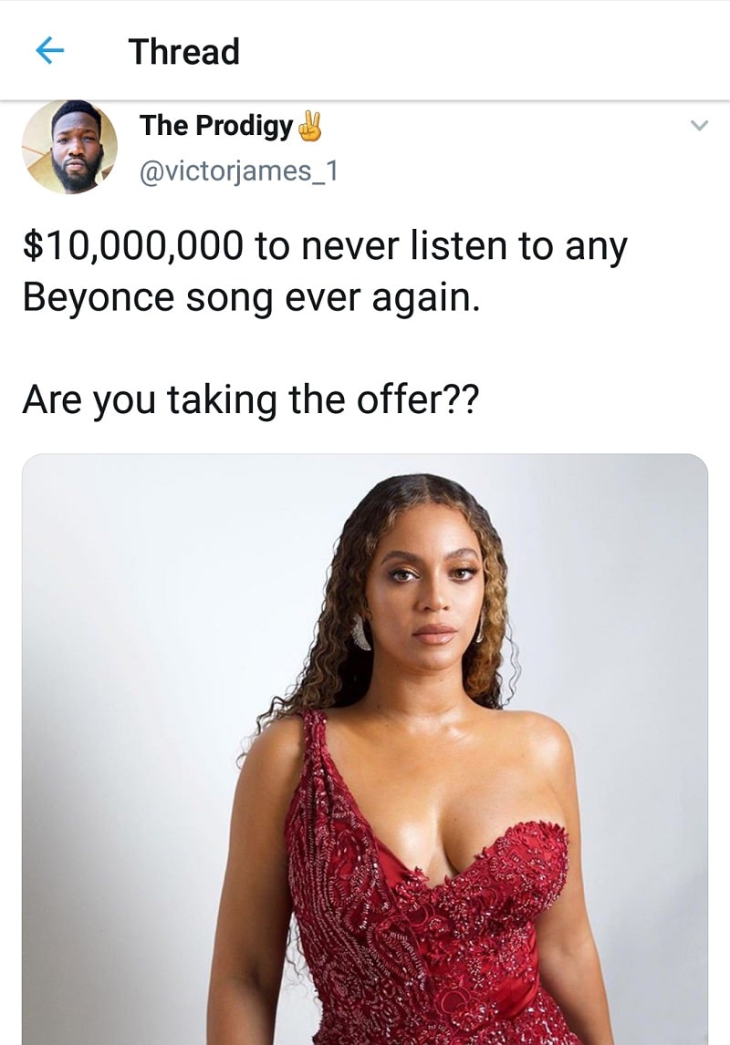 In one of those fun Twitter threads, someone asked his followers if they’d accept $10M just to stop listening to songs by Beyoncé.