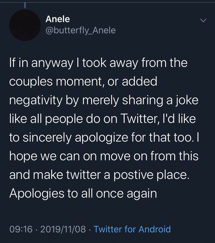 One of the comments under the apology said Anele will only be forgiven if she offered to sweep the entire wedding arena and wash plates that day.