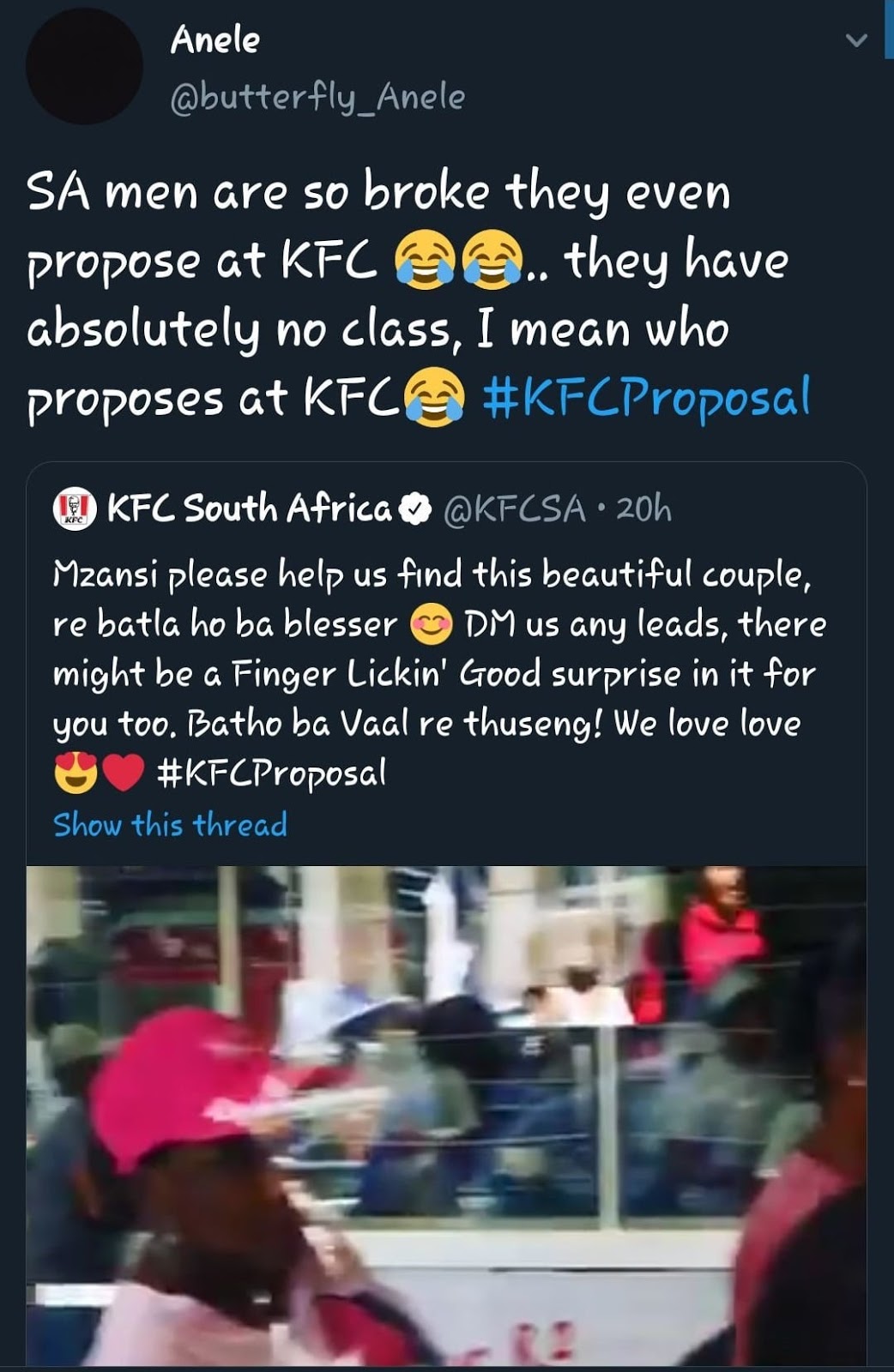 “SA men are so broke they even propose at KFC…they have absolutely no class…I mean who proposes at KFC.”