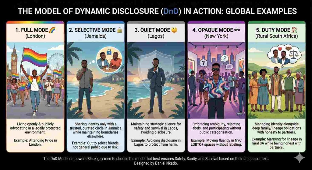 The model presents a five-mode framework for navigating privacy, safety, and authenticity beyond the rigid “coming out” binary. Grounded in cultural realities and survival, it offers practical strategies for living truthfully without risking everything—especially for Black queer life across Africa and the diaspora.
