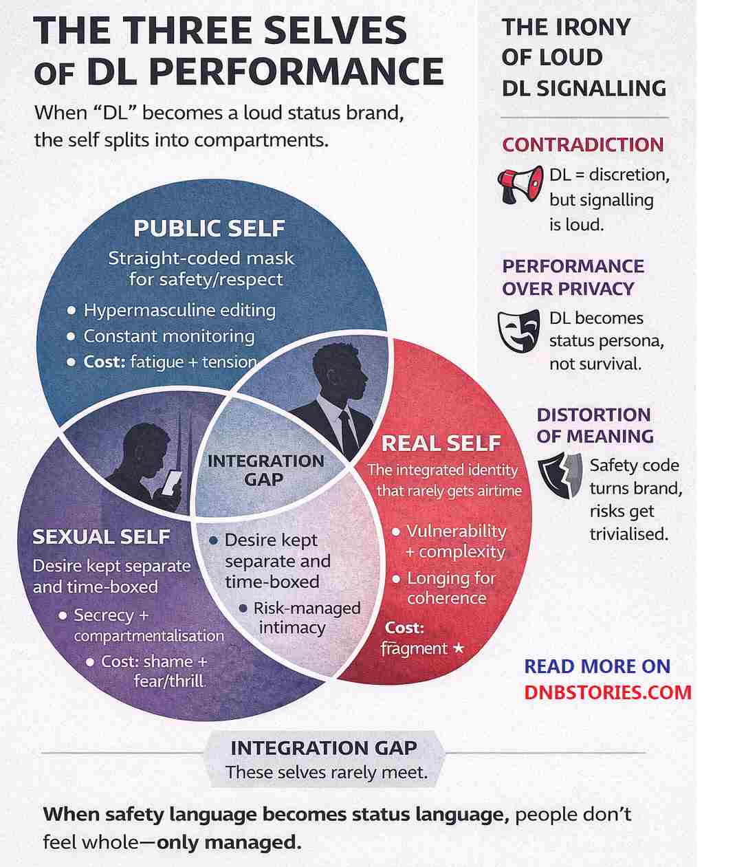 This section addresses the curated performance of DL identities for attention and status on dating apps (e.g., DL posing on Grindr). It intentionally excludes the experiences of LGBTQ+ people in hostile countries with a genuine survival need for secrecy.