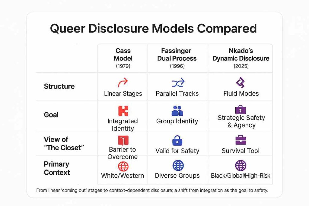 Traditional models, such as Cass’s, taught us that coming out is a journey of courage. Later models, like Fassinger’s, taught us that this journey is complex. Daniel Nkado’s Dynamic Disclosure model teaches us that the journey is ours to control.