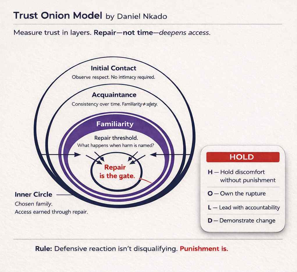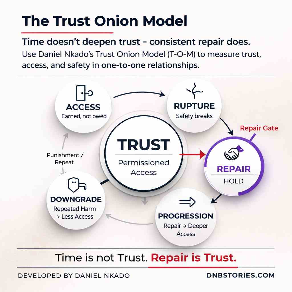 The Trust Onion Model (T-O-M), developed by Daniel Nkado, is a four-layer framework for assessing trust, access, and relational safety in one-to-one relationships. Chemistry, shared identity, or mutual trauma can create fast familiarity, but T-O-M separates mutual feelings and shared time from earned access. The model treats repair competence—the ability to acknowledge harm, take accountability, and restore trust—as the clearest test of safety.