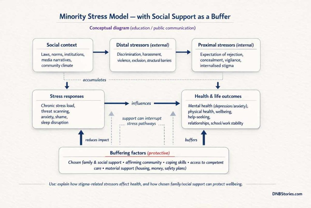 Chosen family steps in when biological family, faith communities, or institutions respond with rejection or sanction, offering stable emotional care and practical support that protect wellbeing and sustain resilience (Frost et al., 2016)[3].