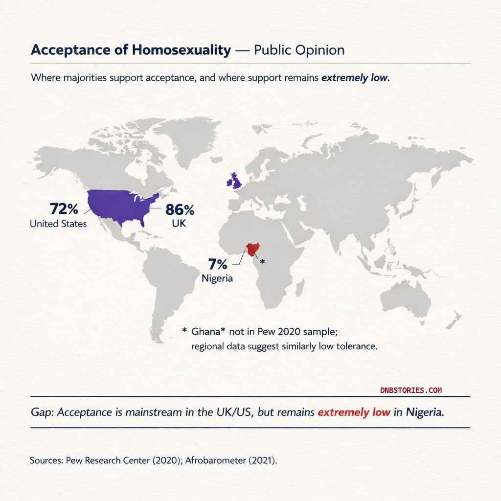 Public acceptance of homosexuality remains high in the UK and US but extremely low in Nigeria, with regional data indicating similar intolerance in Ghana (Pew Research Centre, 2020; Afrobarometer, 2021)[8]. This context explains why chosen family can be formed openly in cities like London and New York, while in Nigeria, Ghana, and many parts of Africa, it primarily operates as small, carefully vetted circles that prioritise risk management over visibility.