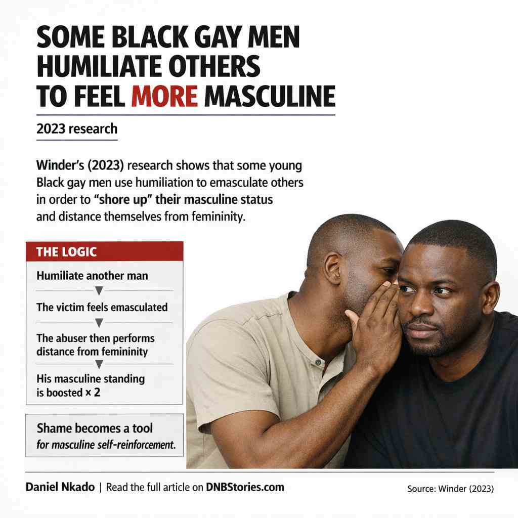 Winder’s (2023)[7] important study of bottom-shaming shows that some young Black gay men use the humiliation of other men to defend masculine status and distance themselves from femininity.