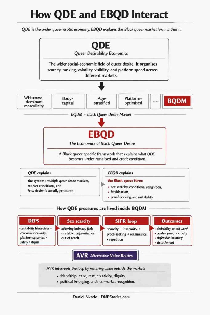 Queer Desirability Economics (QDE) and The Economics of Black Queer Desire (EBQD) operate as two connected levels of the same erotic economy. QDE names the wider social industry through which queer desire is organised. It explains how social conditions turn queer spaces into erotic markets shaped by scarcity, ranking metrics, uneven visibility, desirability volatility, and platform speed. These pressures operate across multiple queer desire markets, including whiteness-dominant masculinity markets, body-capital markets, age-stratified markets, and platform-optimised markets.