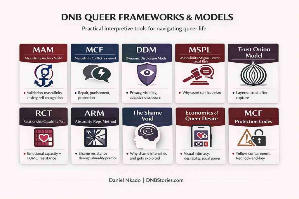 Frameworks interrupt that collapse. They help queer men distinguish shame from evidence, rejection from worth, exclusion from personal failure, and institutional contradiction from individual confusion. They also clarify when a problem is interpersonal, structural, or both.